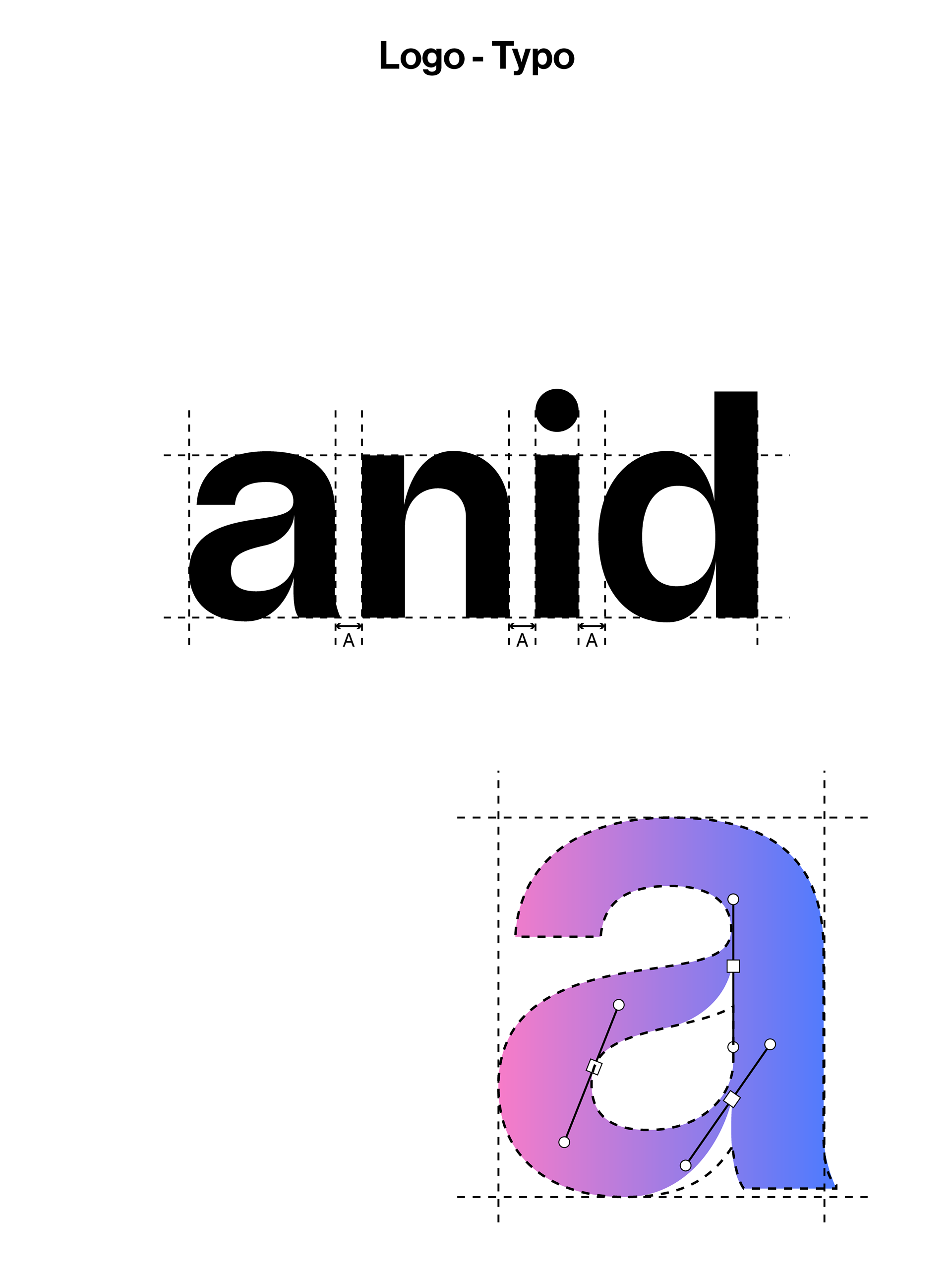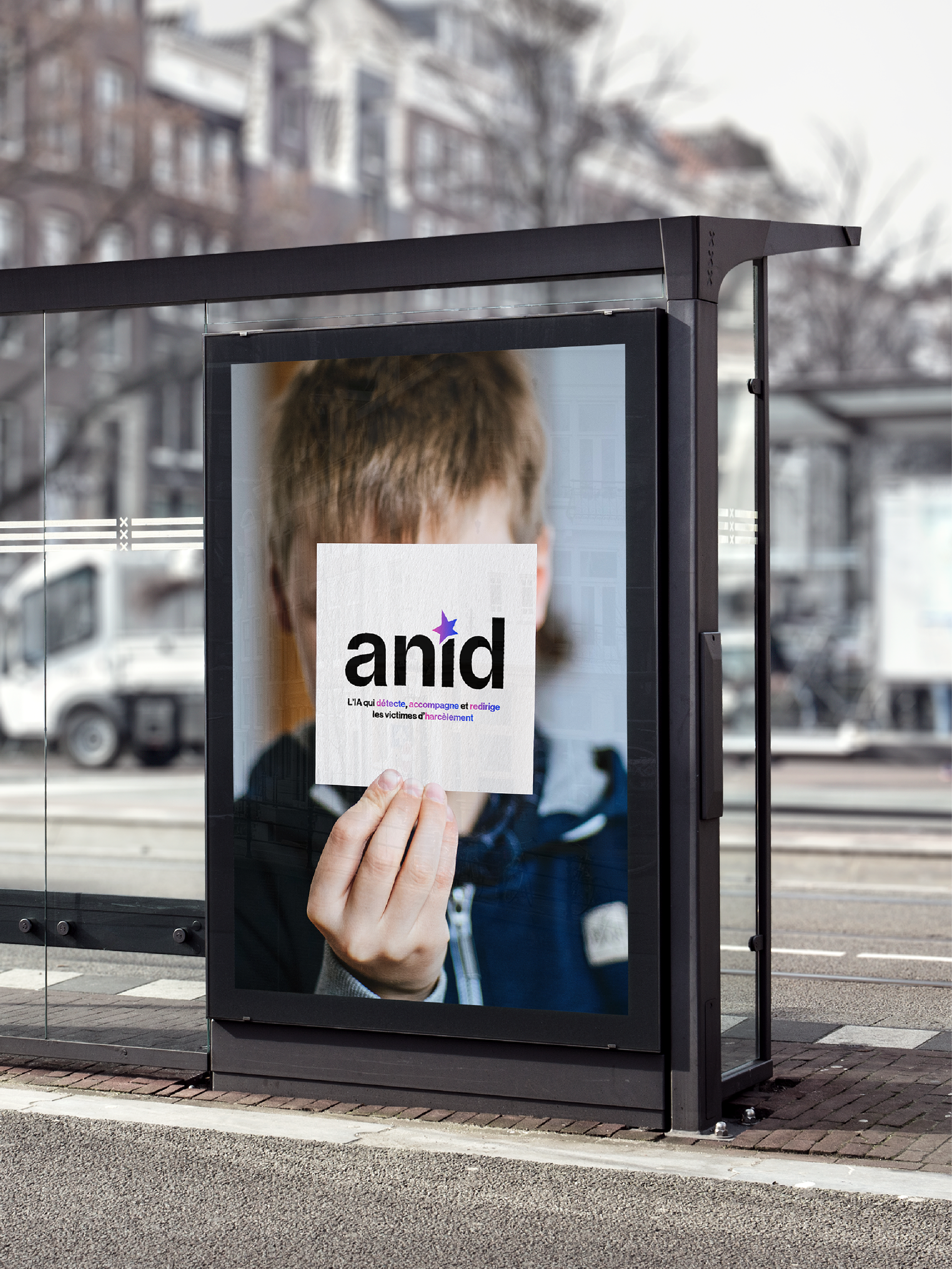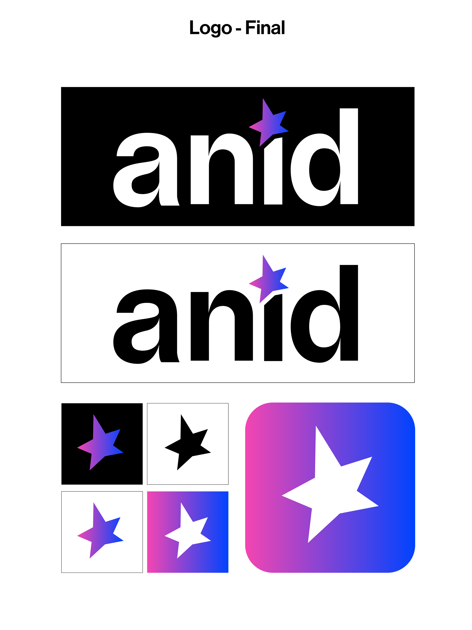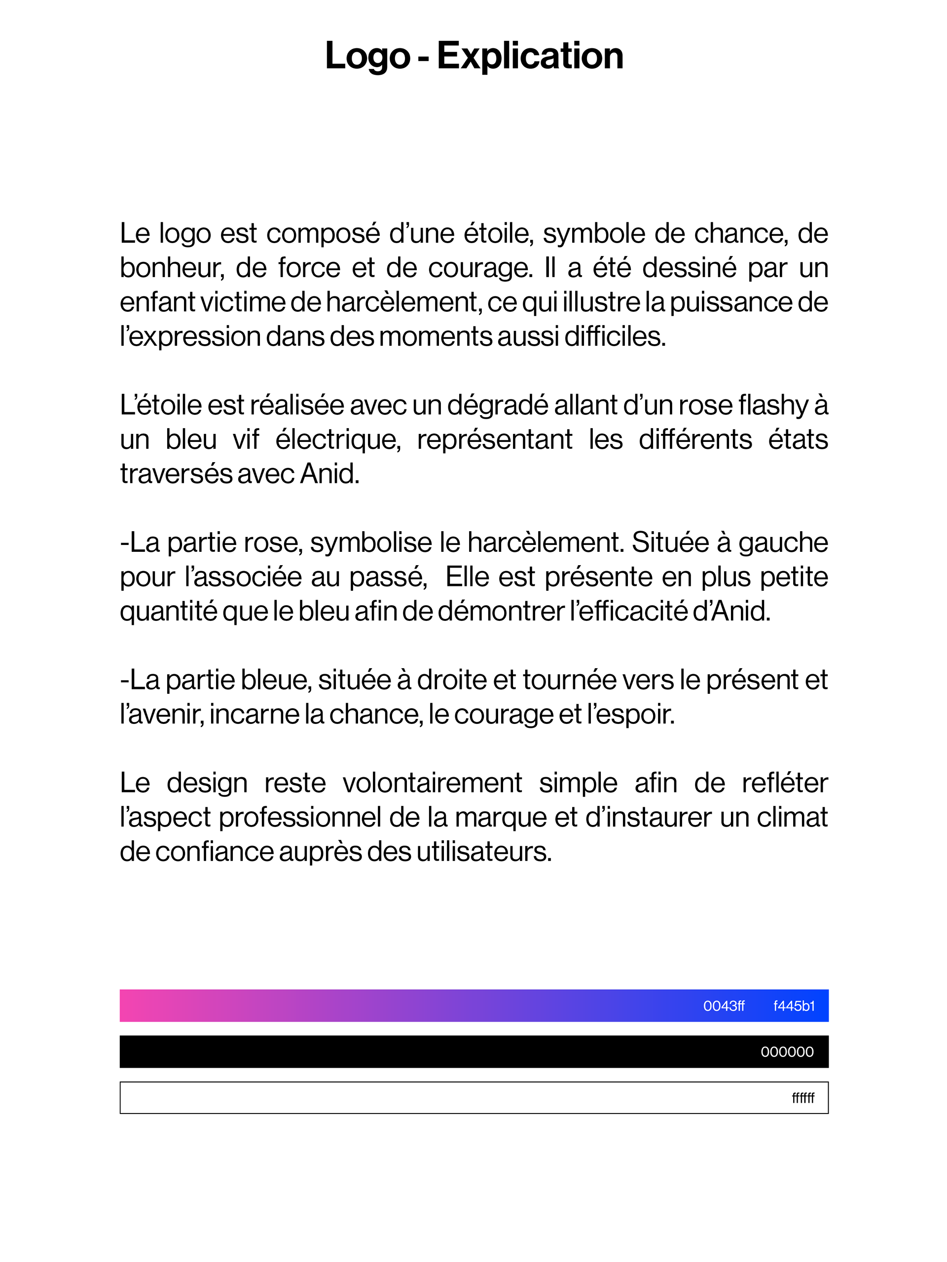 Le logo est composé d’une étoile, symbole de chance, de bonheur, de force et de courage. Il a été dessiné par un enfant victime de harcèlement, ce qui illustre la puissance de l’expression dans des moments aussi difficiles. L’étoile est réalisée avec un dégradé allant d’un rose flashy à un bleu vif électrique, représentant les différents états traversés avec Anid. -La partie rose, symbolise le harcèlement. Située à gauche pour l’associée au passé, Elle est présente en plus petite quantité que le bleu afin de démontrer l’efficacité d’Anid. -La partie bleue, située à droite et tournée vers le présent et l’avenir, incarne la chance, le courage et l’espoir. Le design reste volontairement simple afin de refléter l’aspect professionnel de la marque et d’instaurer un climat de confiance auprès des utilisateurs.