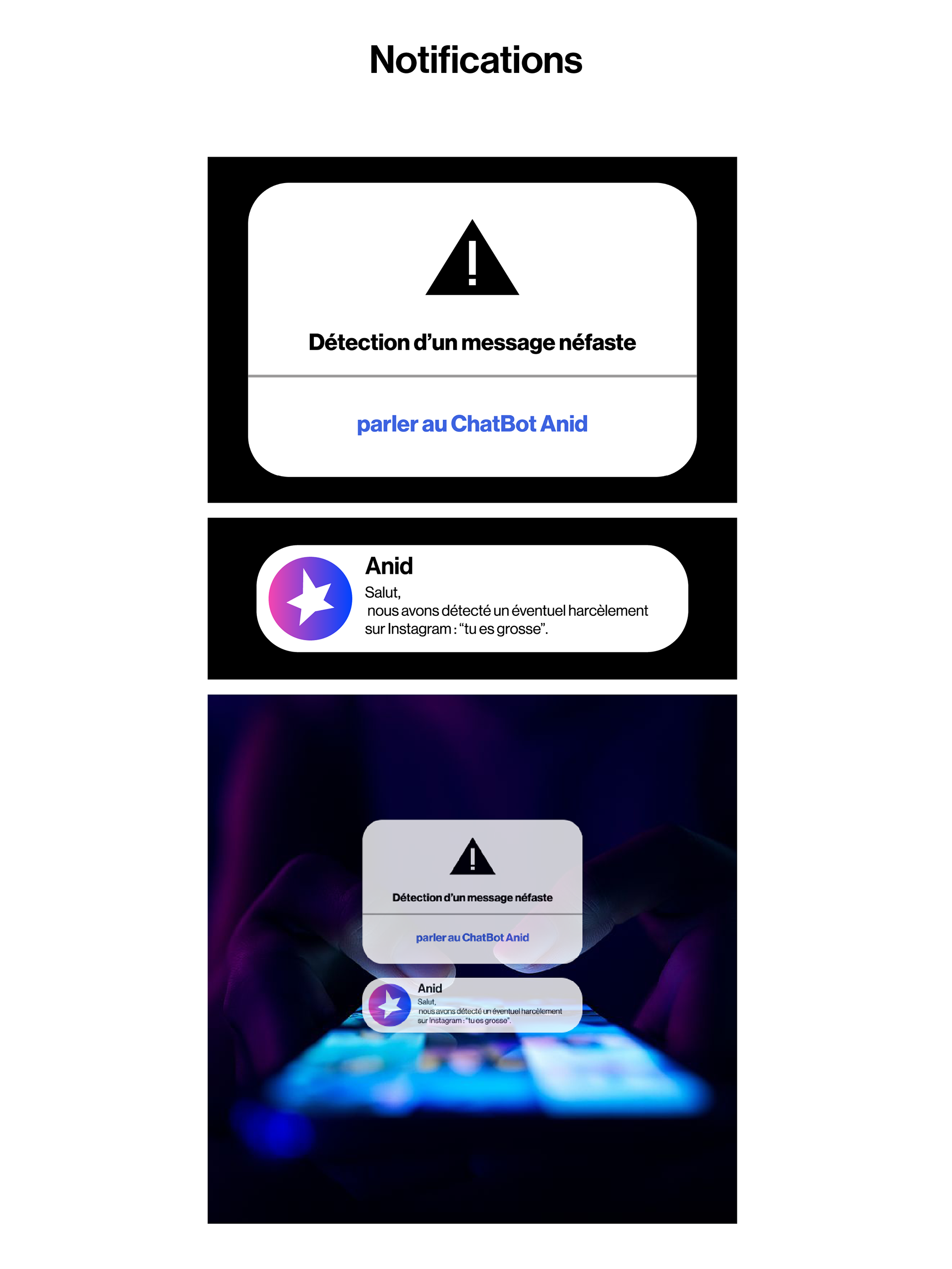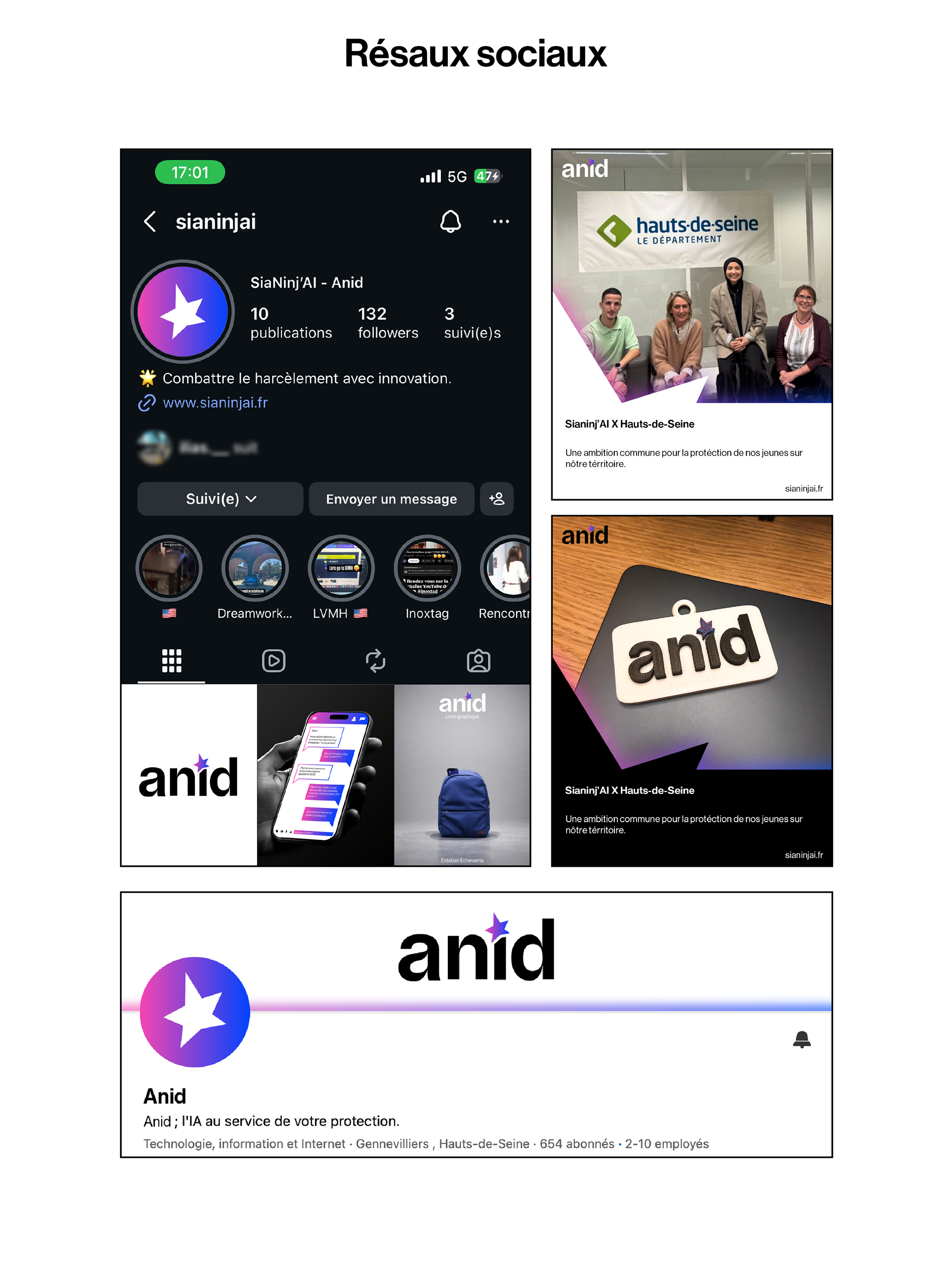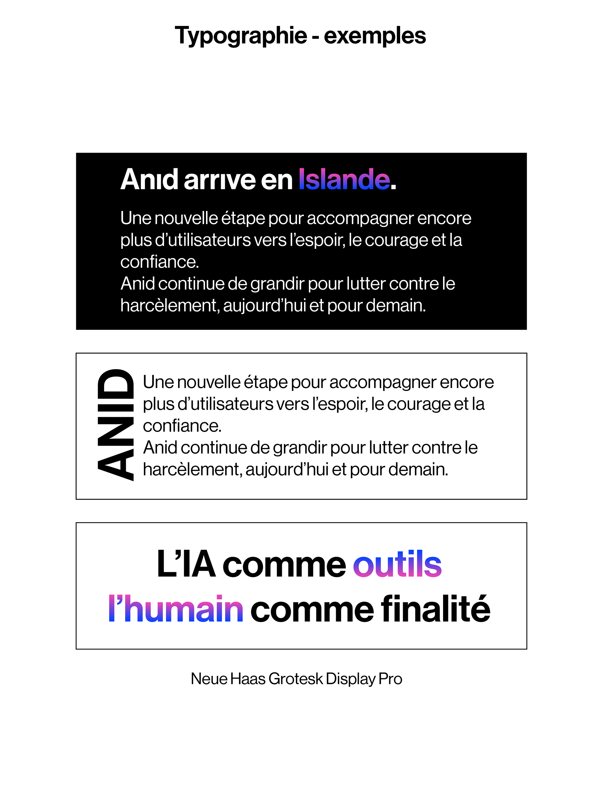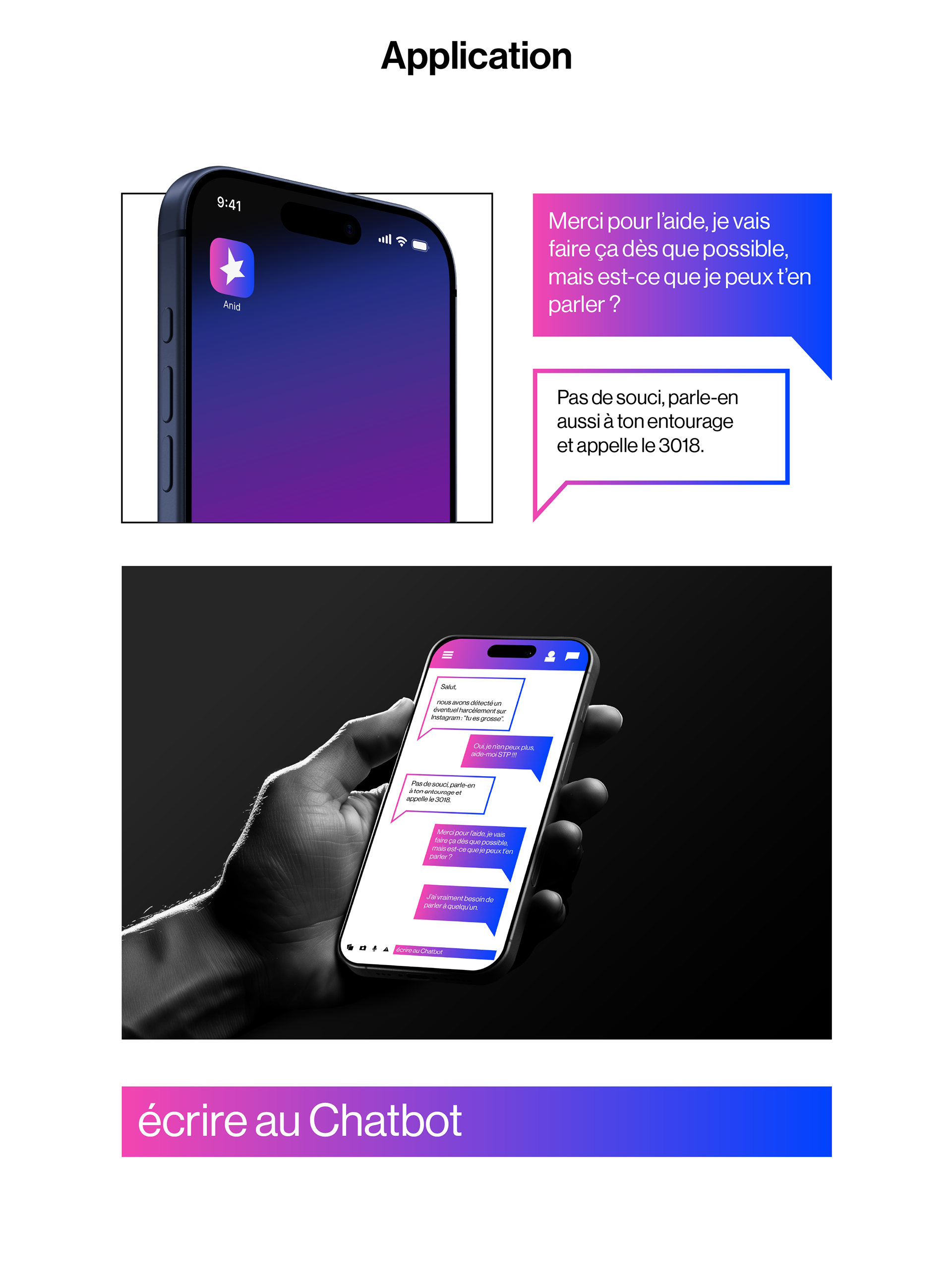 Le logo est composé d’une étoile, symbole de chance, de bonheur, de force et de courage. Il a été dessiné par un enfant victime de harcèlement, ce qui illustre la puissance de l’expression dans des moments aussi difficiles. L’étoile est réalisée avec un dégradé allant d’un rose flashy à un bleu vif électrique, représentant les différents états traversés avec Anid. -La partie rose, symbolise le harcèlement. Située à gauche pour l’associée au passé, Elle est présente en plus petite quantité que le bleu afin de démontrer l’efficacité d’Anid. -La partie bleue, située à droite et tournée vers le présent et l’avenir, incarne la chance, le courage et l’espoir. Le design reste volontairement simple afin de refléter l’aspect professionnel de la marque et d’instaurer un climat de confiance auprès des utilisateurs.